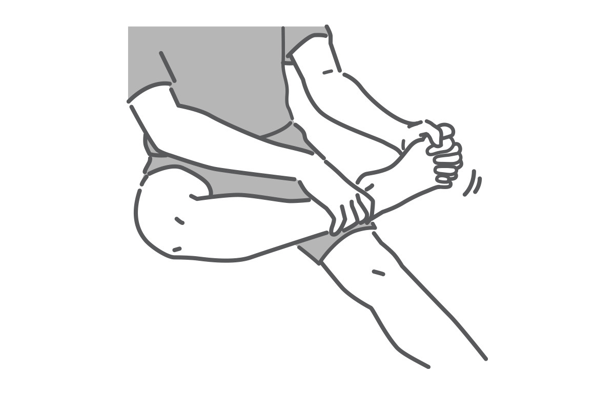 다리를 손으로 덮고 손가락을 구부립니다.